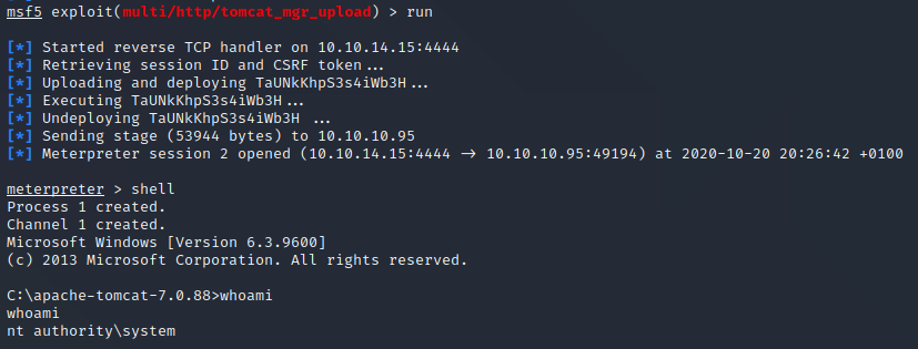 Using those credentials we can use multi/http/tomcat_mgr_upload to get a shell on the system.