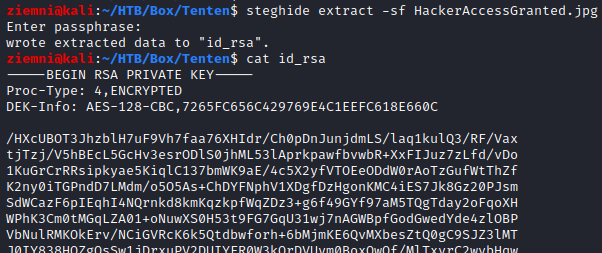 id_rsafrom the image usingsteghide. - Crack key’s passphrase using